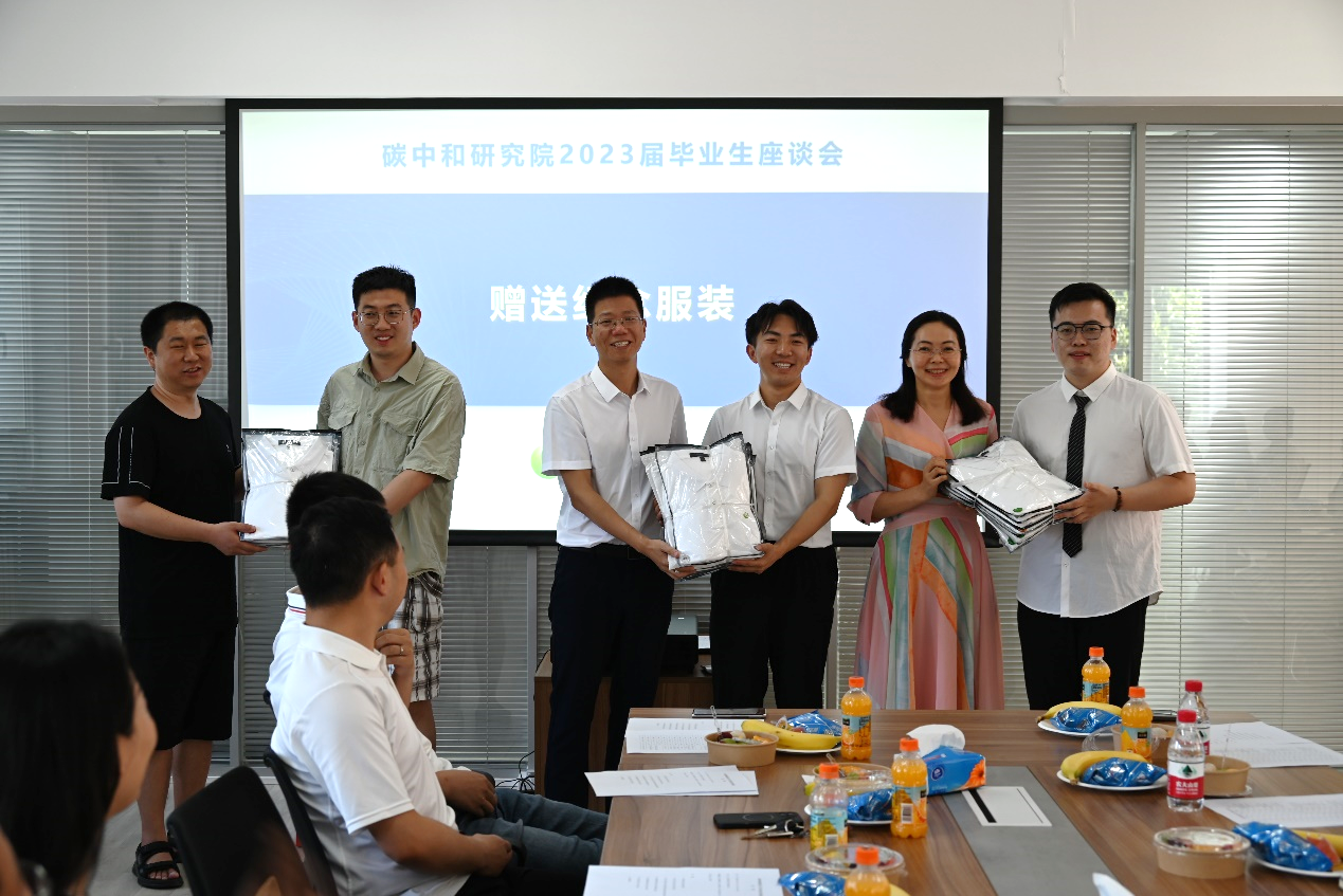 接下来由导师代表为各团队毕业生赠送纪念服装。这套纪念服装是特别为毕业生定制的印有研究院Logo的纪念Polo衫,寓意着毕业生们无论走到哪里都始终是碳中和大家庭里的一份子,母院会一直关注、牵挂着大家。
