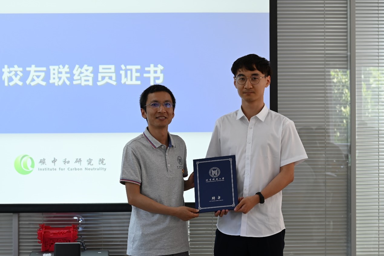 为了让全体毕业生能够在离开母校后保持与母校的联系,研究院特选聘毕业生刘金岳同学担任本届碳中和研究院毕业生的校友联络员。冶金与生态工程学院党委副书记王斌老师为刘金岳同学颁发校友联络员聘书,并嘱咐他要不负领导老师们的期望,做好沟通联系校友和母校的桥梁纽带。