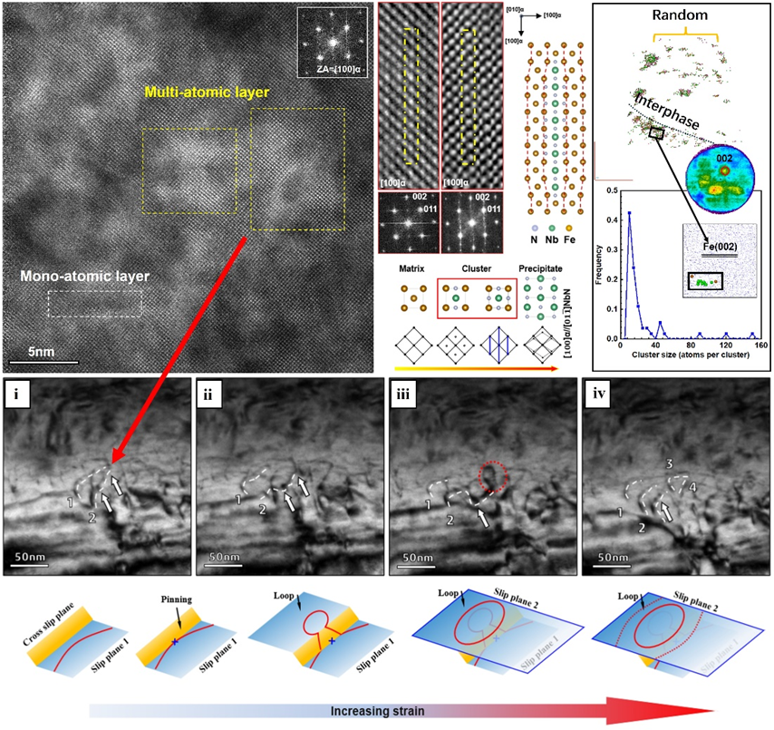 薄带铸轧流程是双碳背景下钢铁工业实现节能减排目标的重要手段。微合金高强钢是制造业重要的钢铁材料。薄带铸轧技术的快速凝固速度和单道次热轧允许微合金溶质在奥氏体中保持过饱和固溶状态,使在后期卷取过程(相变)中引入团簇强韧化机制成为可能。本工作中,利用高精度显微表征设备及原位观测手段,我院毛新平院士团队研究了薄带铸轧含Nb微合金高强钢中的团簇诱导强塑机制,揭示了多原子团簇在促进微合金高强钢位错交滑移与不同滑移面均匀分布的作用机制,明确了薄带铸轧流程在先进高强钢开发中的广阔应用前景。
