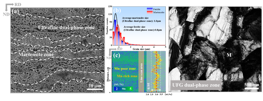 中锰钢(3-12 wt. % Mn)是先进高强钢的代表钢种,具有优异的强塑性。然而,锰含量高和退火时间长等问题限制了中锰钢的规模化应用。这项研究中,我院毛新平院士团队采用传统的轧制和临界区退火工艺在低锰含量的中锰钢 (3 wt. % Mn) 中调控出一种新型异质结构,该结构由交替分布的带状马氏体和带状超细晶双相结构(马氏体+铁素体)组成。实验结果表明,这种具有该异质结构的中锰钢不仅具有比传统中锰钢更低的锰含量和更短的退火时间(8 min),且力学性能优异(拉伸强度1452 MPa,总延伸率17%)。本项研究为解决中锰钢在机械性能、高锰含量和临界区退火时间长之间长期存在的矛盾提供了一个有效的范例