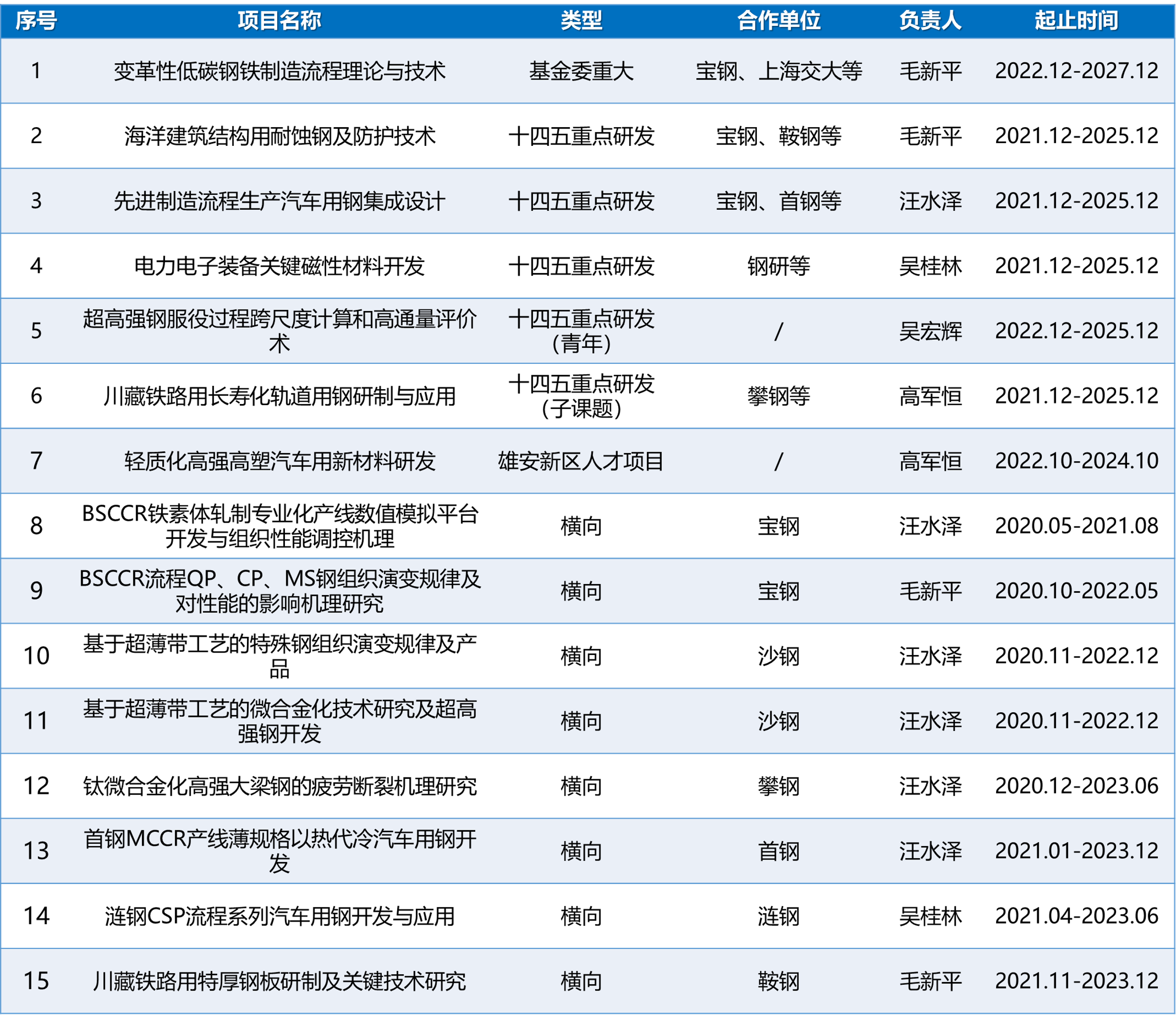 近年来参与多项国家项目及企业合作项目,包括变革性低碳钢铁制造流程理论与技术(基金委重大项目)、多项十四五重点研发项目及校企合作项目,并与知名企业高校合作。