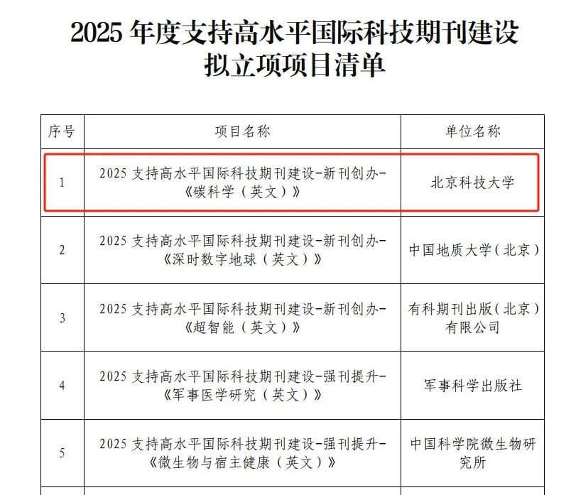 近日,北京市科学技术委员会、中关村科技园区管理委员会发布《关于公示2025年度支持高水平国际科技期刊建设拟立项项目的通知》,北京科技大学主办的国际英文期刊cScience(《碳科学(英文)》)入选。