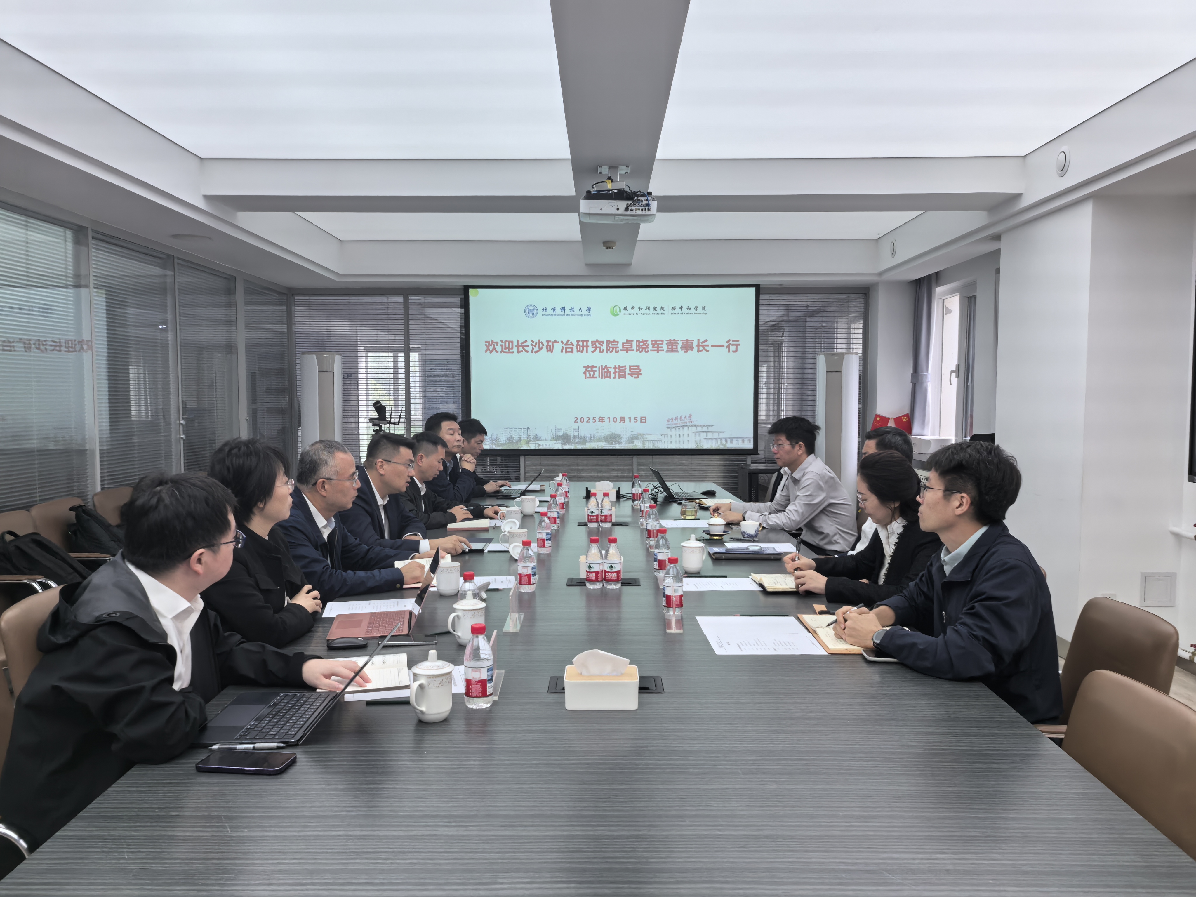 10月15日,中国五矿集团长沙矿冶研究院党委书记、董事长卓晓军率队莅临我院,就深化校企合作、共促产学研深度融合等议题进行广泛而深入的交流。长沙矿冶研究院有限责任公司党委委员、副总经理易峦,北京科技大学碳中和研究院、碳中和学院院长毛新平院士,研究院执行院长汪水泽,学院执行院长侯新梅,以及相关单位负责人、教师代表共同出席会议。