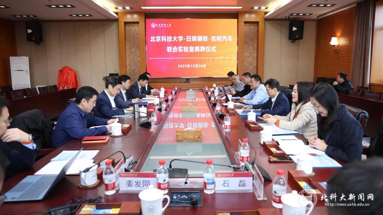 2025年12月26日,学校与日照钢铁控股集团有限公司(以下简称“日照钢铁”)、吉利汽车集团有限公司(以下简称“吉利汽车”)三方共建的低碳高性能汽车用钢联合实验室揭牌仪式在学校举行。学校副校长张卫冬,中国工程院院士、碳中和研究院院长、碳中和学院院长毛新平,日照钢铁总经理徐现鹏,吉利汽车副总裁李传海等出席签约仪式。仪式由学校科技成果转化研究院副院长王晓晨主持。